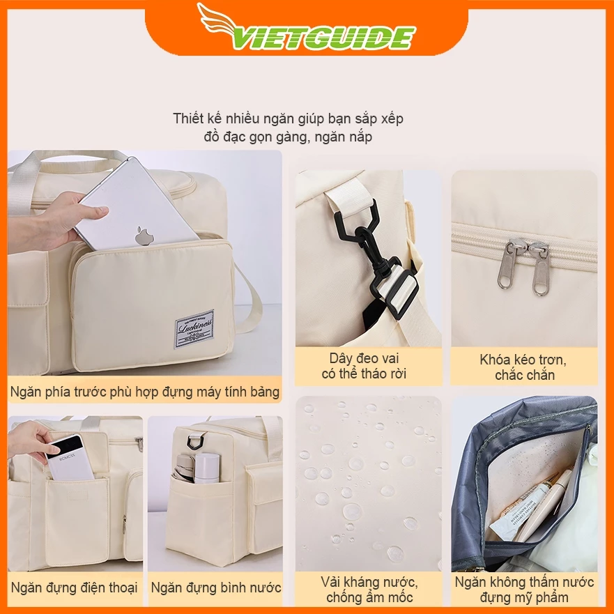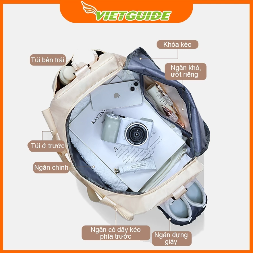 Tính năng: Gấp gọn, chống thấm, nhiều ngăn tiện lợi, ngăn đựng giày, ngăn chống nước, tách biệt đồ ướt – khô.